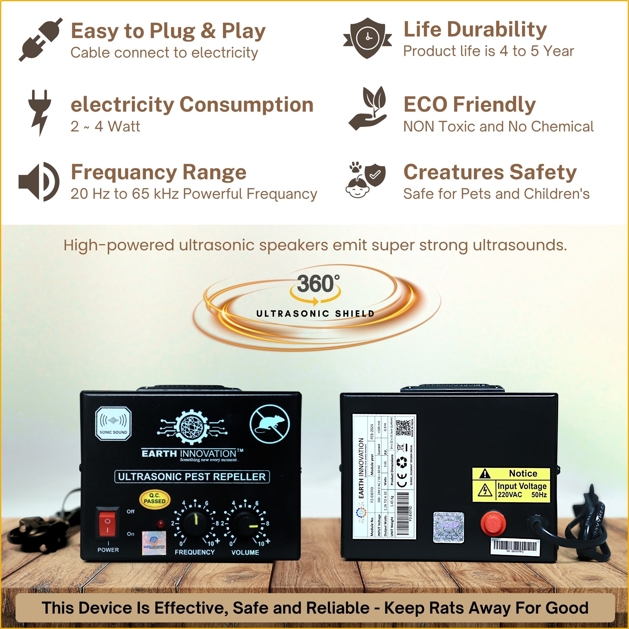 ⭐ 100% SAFETY 🛡️ : Defender Sonic Rat Deterrent™ Device is hygienic, safe, reliable, does not contain chemicals, does not pollute the environment and has no side effects on humans and environment friendly alternative to dangerous poisons and Sprayers, chemicals and traps, no bad smell and Corpses. 🌱 ( Humans can hear this sound and it does not cause any harm to humans ) 🔊