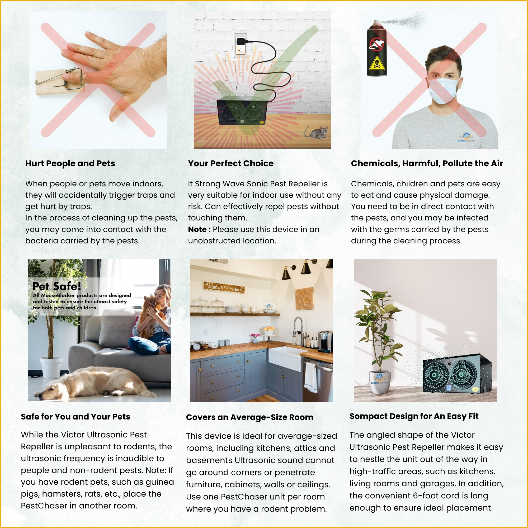 ⭐ NO ANY CHEMICALS AND TRAPS ♻️ : Powerful STRONG WAVE Ultrasound Rat Repellent® Device Produce 3 – dimensional Sonic waves to repel: Rodent, Rat, Mice, Squirrel and Carries out pest control within their effective ranges which cover any nooks in all directions, horizontally and vertically Indoor. 🦨 Sonic – ultra sound enhances rodent control provides a more humane way to replace any other pest control measures that may require the use of harmful chemicals or poisons.🚫